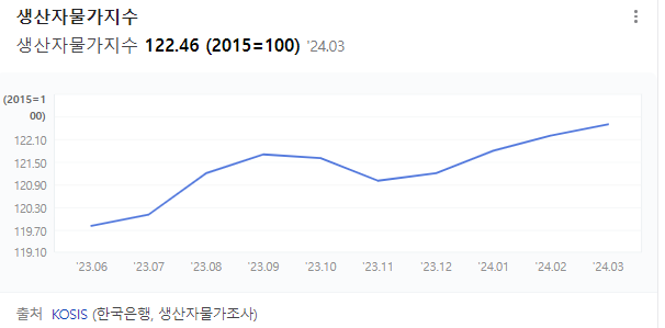 CPI와 비슷한 용어로 PPI가 있는데요, PPI는 Producer Price Index의 약자로 우리말로 '생산자물가지수'라고 합니다. 생산자물가지수는 국내생산자가 국내시장에 공급하는 상품 및 서비스의 가격(국내생산자의 도매가격)의 변동을 종합하여 지후화 한 것입니다. CPI는 소비자가 구매할 때의 가격지수라고 하면 PPI는 물건을 만들어내는 기업의 생산원가지수라고 할 수 있습니다.
